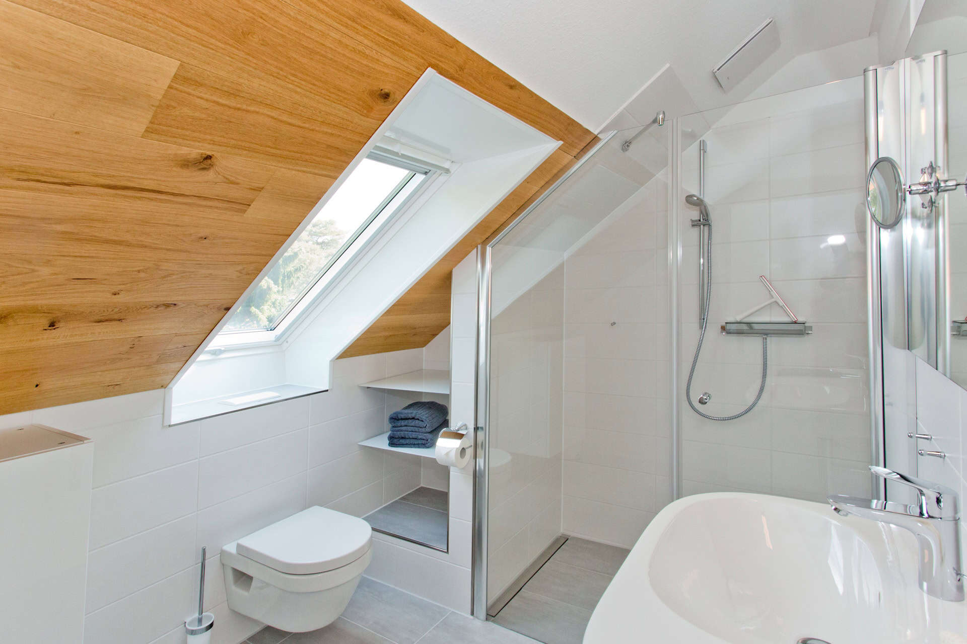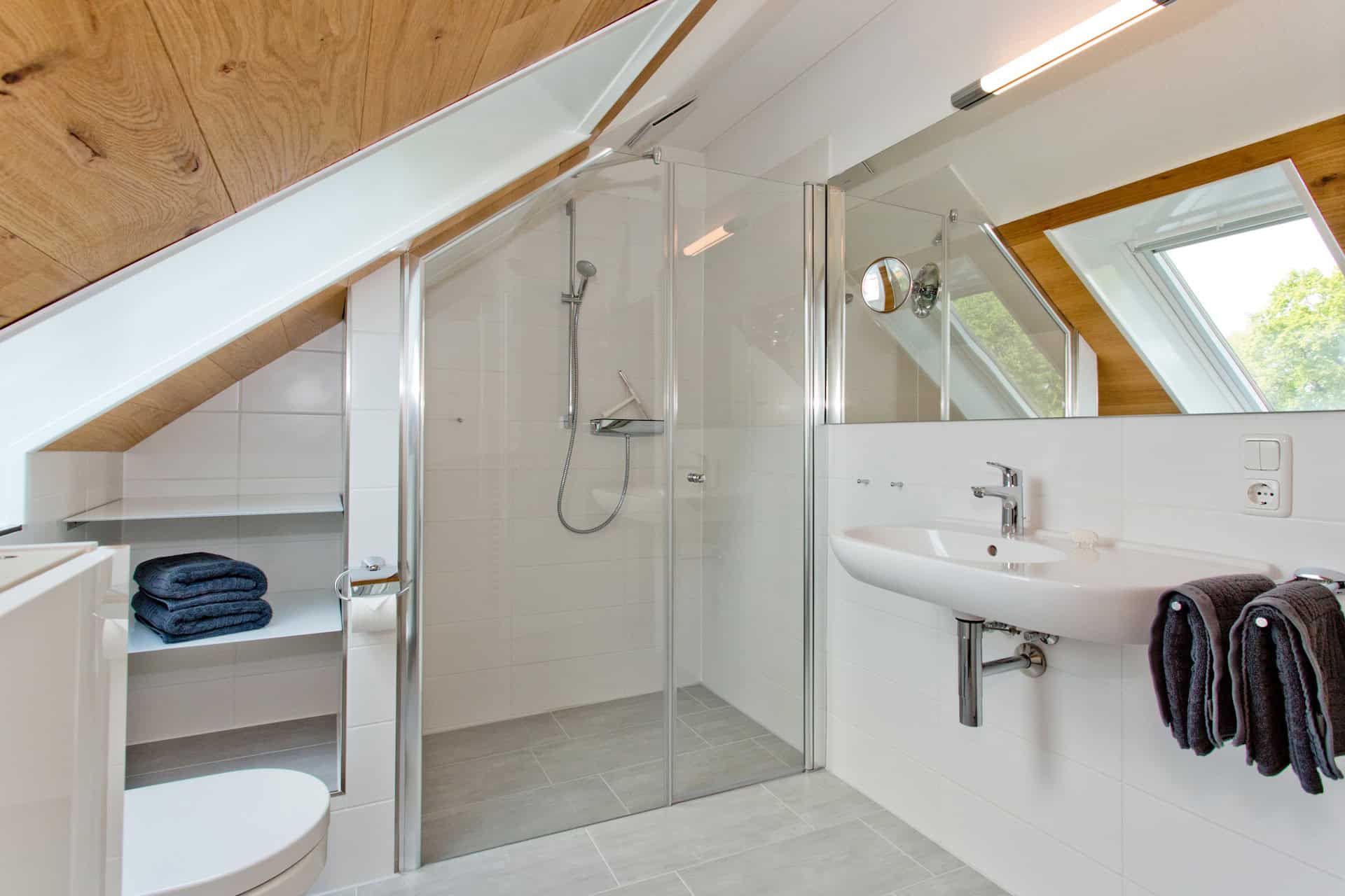 Das Bad hat ein Waschbecken, eine Toilette und eine barrierefreie Dusche. Föhn, Kosmetikspiegel, Ganzkörperspiegel, Handtücher, Seife, Kosmetiktücher, Desinfektionsmittel und Toilettenpapier liegen für Sie bereit.