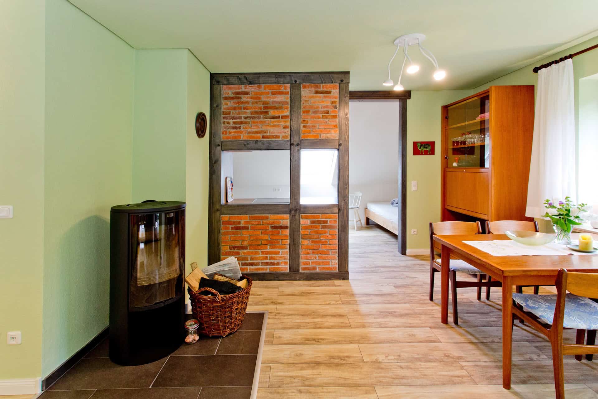 Im Esszimmer oben ist ein Kaminofen. Das Feuerholz stellen wir Ihnen gerne zur Verfügung. Der Esstisch lädt mindestens 8 Personen ein. Mit einem weiteren Tisch kann die Tafel für 15 Personen hergerichtet werden.