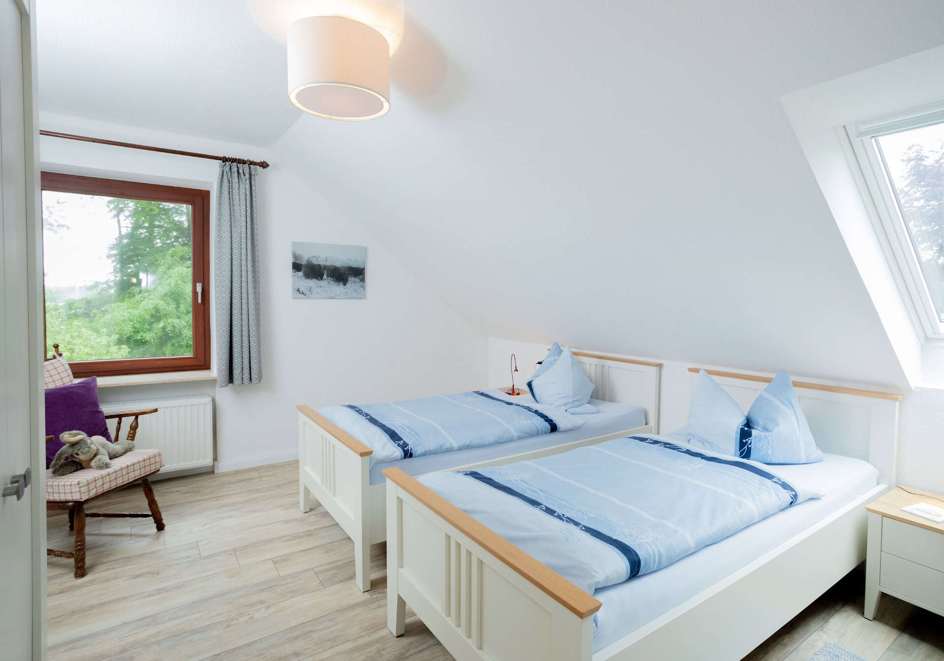 Das größere Schlafzimmer verfügt über ein Doppelbett (180 x 200 cm) (offenes Fußende) und das 2. Schlafzimmer über 2 einzelne Betten (100 x 200 cm) alle mit einer Komforthöhe. In beiden Schlafzimmern können wir Ihnen ein Kinderreisebett aufstellen.